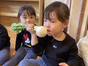 「おおきなかぶ」の絵本を読んだ後に実際のかぶで大きさを確かめてみることに。絵本ではとても大きかったのに本物のかぶは小さいことに気づいたり、匂いを確かめたりしましたよ。そのほかにも「かぶは白で葉っぱはみどり!」など発見がたくさんでしたよ。