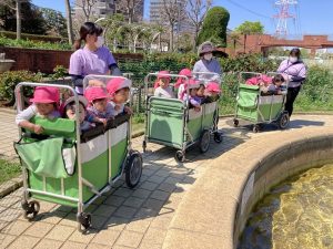 4月から入園した新しいお友達は初めてのお散歩に少しドキドキの様子です!準備ができたらバギーに乗ってお散歩に出発!
