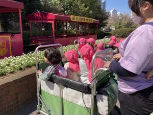 お散歩の途中には、園内を走っている電車にも会うことができました。