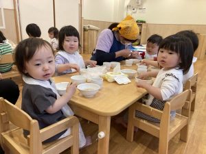 お散歩から帰ってきた後は給食の時間です!お散歩中は涙を見せていた子も、ご飯の時間になると笑顔を見せ、夢中になって美味しそうに食べていましたよ!