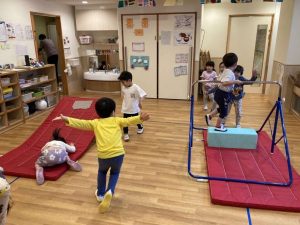 他にも鉄棒や後転練習で斜面になったマットで練習していた子ども達。