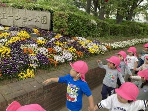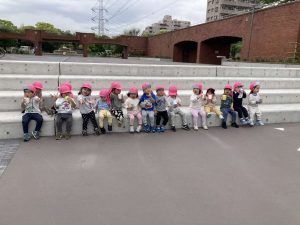 噴水が見えてくると「せんせ~、みて~!」と笑顔で教えてくれました。水量が少なくなってしまった噴水にみんなで「おおきくなあ~れ~!」と何度も声掛けすると、勢いよく吹き出した噴水に歓声が上がりました!みんなで広場に座ってお茶を飲んで一休み。