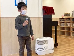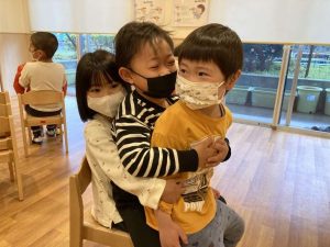 自分の名前・好きな食べ物の発表です。緊張してる子もいましたが、大きな声で発表する事が出来ました。自己紹介が済んだ後は、椅子取りゲームをしました。ちょっぴりアレンジを加え…