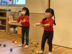 お友達の膝の上に座っていく、『仲良し椅子取りゲーム』。「ぐらぐらするよー。」、「崩れるー。」と言いながら、大盛り上がり。異年齢交流を楽しみました。その後は、楽しみにしていた、体験型プログラム(体操)。憧れの、赤Tシャツを着て、とっても嬉しそう。鉄棒・マット・跳び箱・ボール等を使って、体を動かしました。