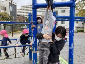 公園に着いて公園の約束を話してから、スタート♪高い遊具も先生に支えてもらいながら挑戦!