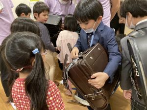 ランドセルを背負い、先生やお友達にご挨拶。