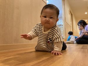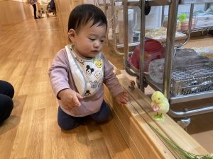 少しずつ歩けるようになり、保育者に手をつないでもらいてくてく。