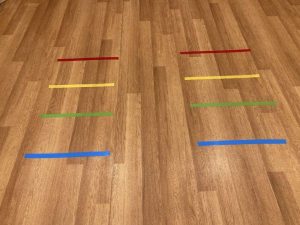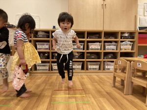 お部屋にカラフルなラインが引かれました。赤いラインからどこまで跳べるのかチャレンジする子どもたち。「きいろ、みどり、あお!」「あおまでとべるよ~!」と楽しげにお話をしながらジャンプジャンプ。