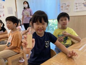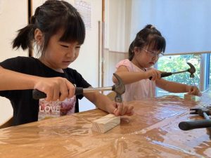 始めて手にする、のこぎりに、ドキドキしていましたが、切り終わると、「出来たー!」と嬉しそうな顔を見せてくれました。その後は、トンカチを使って、釘打ち。指を打たないように、慎重です。トントン・トントンお部屋中にいい音が響きます。