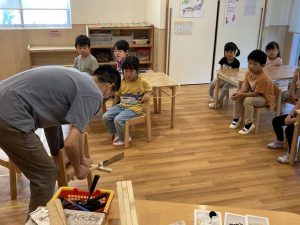 危ない工具を目の前に、説明を聞く子ども達の顔も、真剣です。説明が終わると、1人ずつ順番に、のこぎりタイム。しん先生に手を添えてもらいながら、好きな長さに切りました。