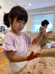 続いて、イカ焼き作り。身の部分となる、トイレットペーパーの芯や、げそ部分となる梱包用のエアキャツプに絵の具を塗りました。