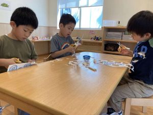 両手を絵具だらけにし、次第に、子ども達の表情も真剣。まるで職人さんみたいです。これらの作った食べ物は、後日、お店屋さんごっこで販売!ということで…お買い物に必要な、お金も作りました。