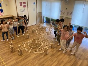 気が付いたら、お部屋の中に街が!!街の名前も、子ども達が考え、『にじのいるか国際競技場』に決定!オリンピックを思い出すような?!素晴らしい競技場が出来ました。