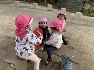 シーソーに乗って、とても楽しそうな笑顔が見られました。お友だちと一緒だと楽しいね!
