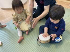 お散歩に行く前にお部屋で楽器遊びをしました