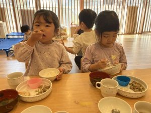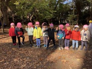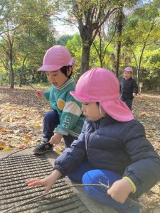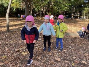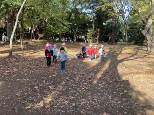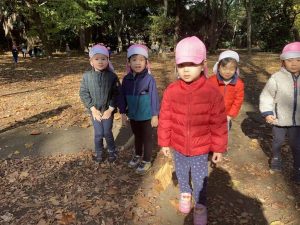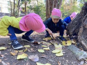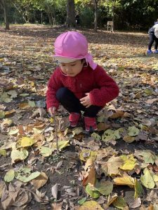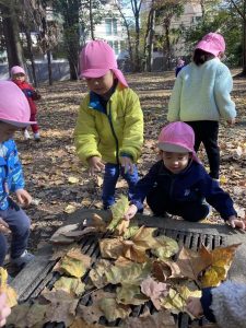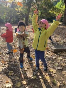 その後は落ち葉を集めてたき火ごっこをしたり、落ち葉のシャワーをしたりして楽しみました。