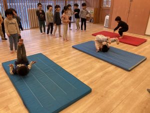 ボール、フラットフープ、鉄棒、跳び箱の上から前転も行ないました。