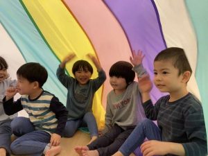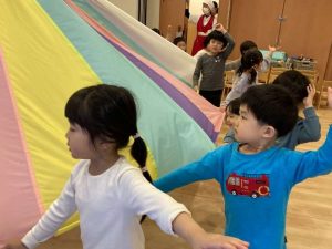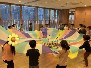 今日は3.4歳児合同でジャンケン列車とパラバルーンをしました!