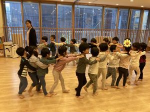 波、家、花、メリーゴーラウンドの技をし、最後に曲に合わせて取り組み、ポップコーンをしました!