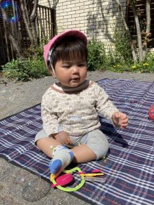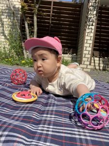 気になる玩具に手を伸ばし、握ったり噛んだりして