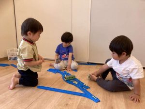 電車が大好きな子どもたちは、プラレールに夢中です。