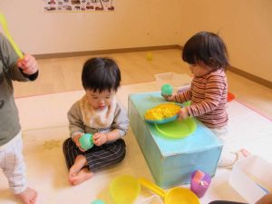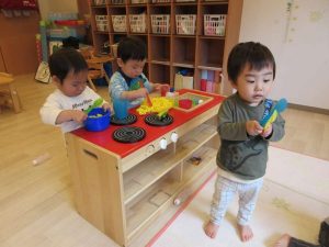 そら組は新しい玩具に夢中で、ままごと遊びなどを夢中で楽しんでいました。