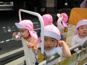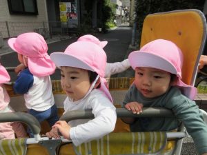 バギーの中から、車や犬、草花を見て「わんわん!」「ブーブー」「はっぱっぱ!」と嬉しそうに反応していました。日差しや風も心地良く、気持ちよさそうな表情をしていましたよ。