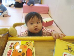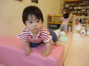 玩具棚を支えにつかまり立ちをしたり、巧技台に登ったりと、この1ヶ月の中でもとても成長を感じました。