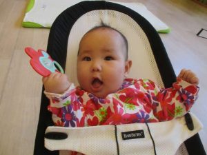 バウンサーに揺られながら音の鳴る玩具を握り、口に含んで感触を確かめたり、音を鳴らしたりしています!