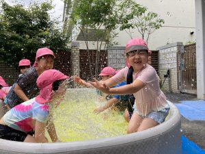 まずは2グループに分かれて水を掛け合い、水慣れをしました。