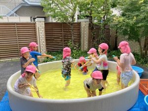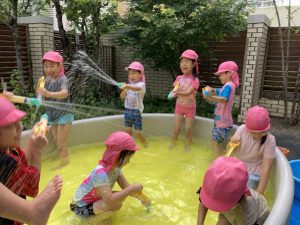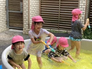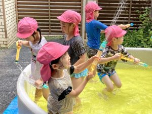 手に取るとすぐに友だち同士で水をかけあったり、水をかけられないように逃げたり等、