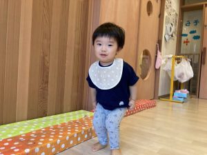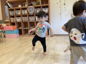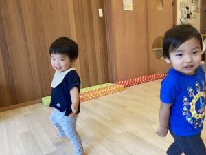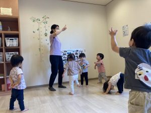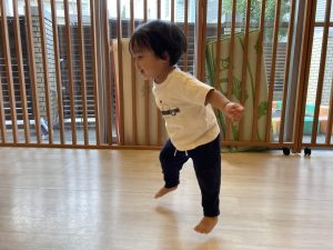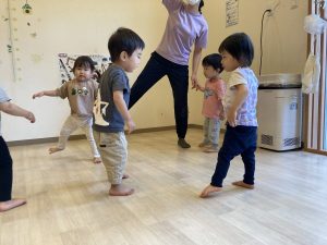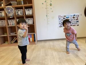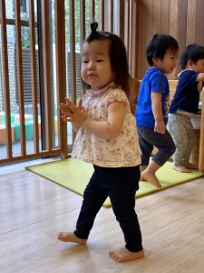 保育者の動きをじっと見つめ、真似をして動くことが上手になってきました。