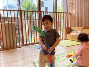 井形ブロックは、長く繋げ「何を作っているのかな?」と見ていると