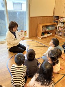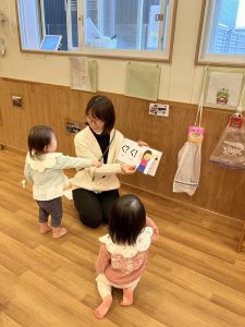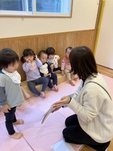 1歳児クラスでは、絵本の言葉を声に出す子どももいました![]()