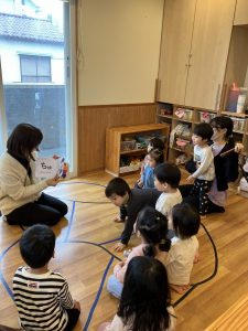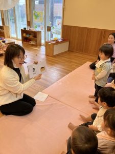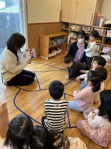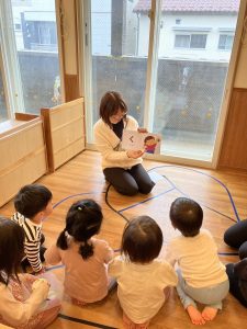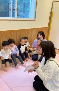 1歳児クラスでは、絵本の言葉を声に出す子どももいました![]()