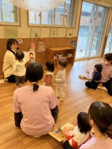 0歳児クラスでは、興味しんしん👀童心社の方の優しい声にじっと耳をかたむけています![]()