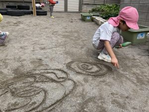 指を上手に使ってクルクル◎ 園庭も子ども達にとってはキャンパスになりますね🖍