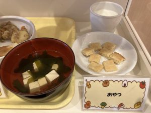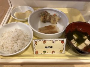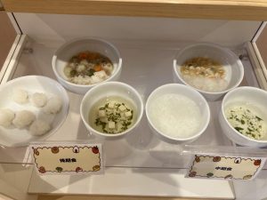 玄関前に中期・後期の離乳食と、幼児食のサンプルを掲示しているのでよかったら見てみてください![]()