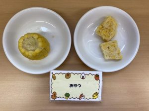 今日のおやつはコーン蒸しパン(乳児クラス・きいろ組)、ゆでとうもろこし(おれんじ・あか組)を提供しました。