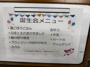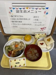 こんにちは、栄養士です! 今日は誕生会メニューを紹介します。 今月は旬の食材を使った和食メニューです。 おやつのハート型に抜いたジャムサンドはかわいいと喜んで食べてくれました 10月生まれのおともだちお誕生日おめでとう♪