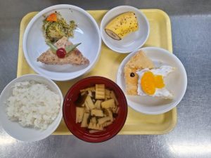 こんにちは!栄養士です。 今日は23日に提供したこどもの日メニューを紹介します 給食のハンバーグは兜、おやつのケーキはこいのぼりをイメージして盛り付けました。 ハンバーグはどこのクラスもよく食べてくれました!