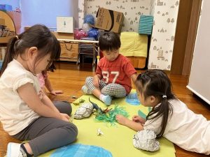 草原や池があって、パパ恐竜や赤ちゃん恐竜など