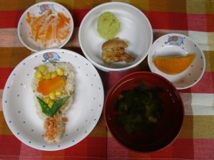 今日の給食はお正月メニュー、おやつに七草がゆを食べました。