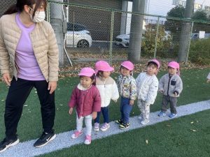 白線から落ちないように列になって走る子どもたち。