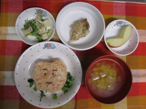 りんごの形をしたごはんに大喜びな子どもたち。