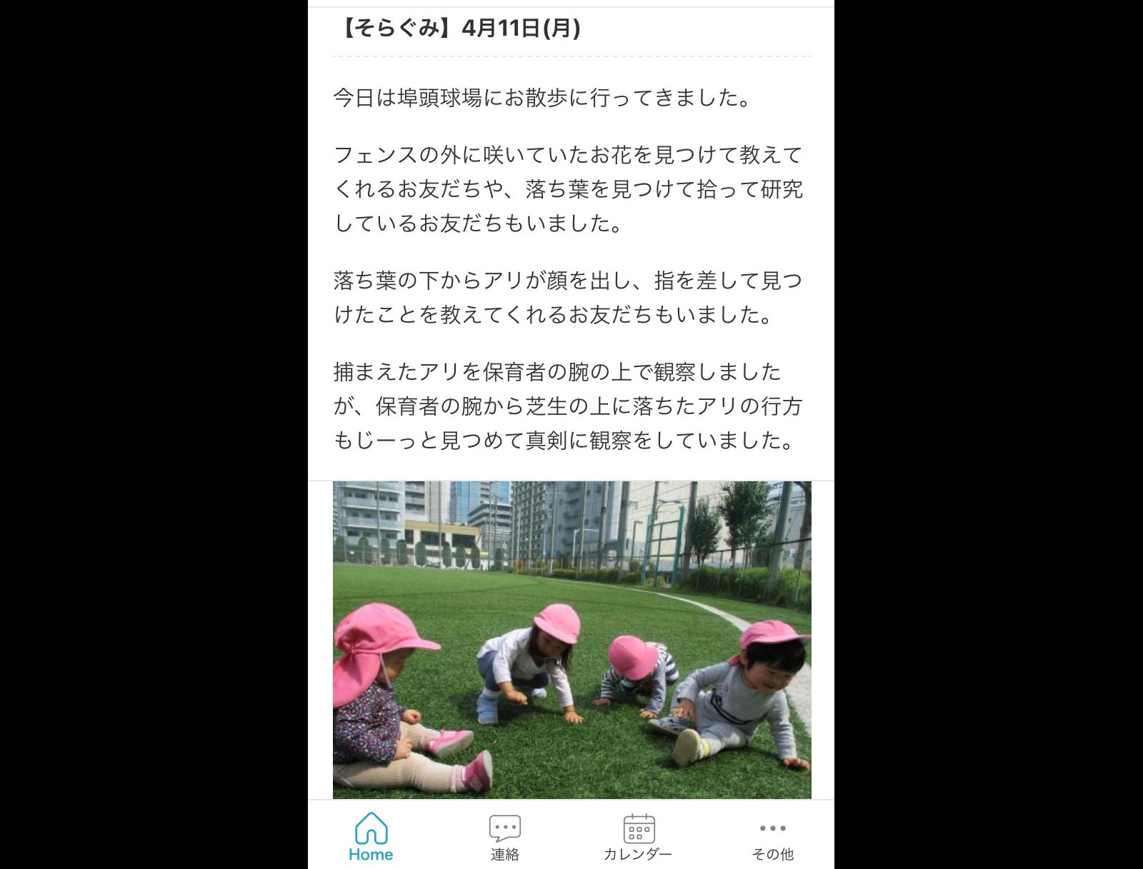 園⇔ご家庭の連絡はアプリで行っています。また、クラスの保育の様子を毎日、写真と文章で配信したり、毎日の給食の献立を写真とともに配信しています。