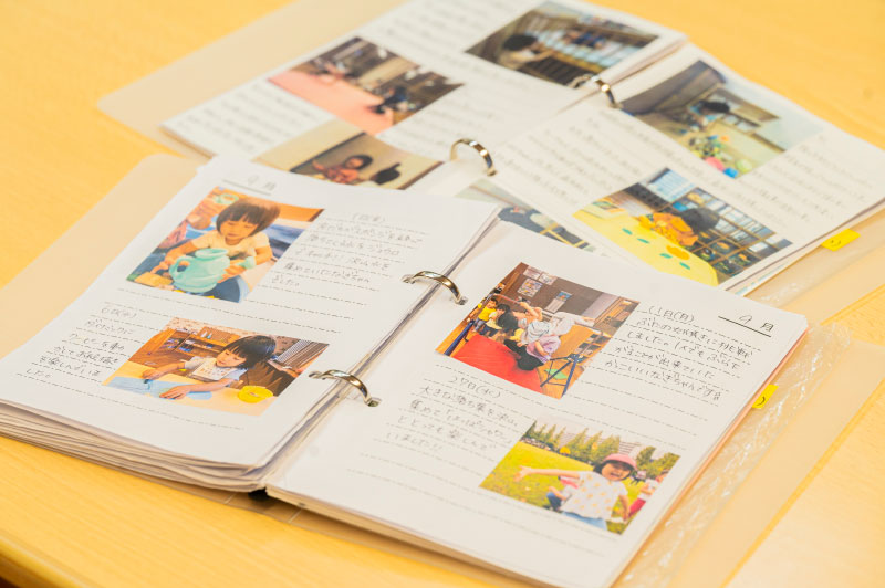 お子さんの成長を感じる瞬間の写真にコメントを添えてお知らせしています。年度が終わる頃には1冊のアルバムになっています。